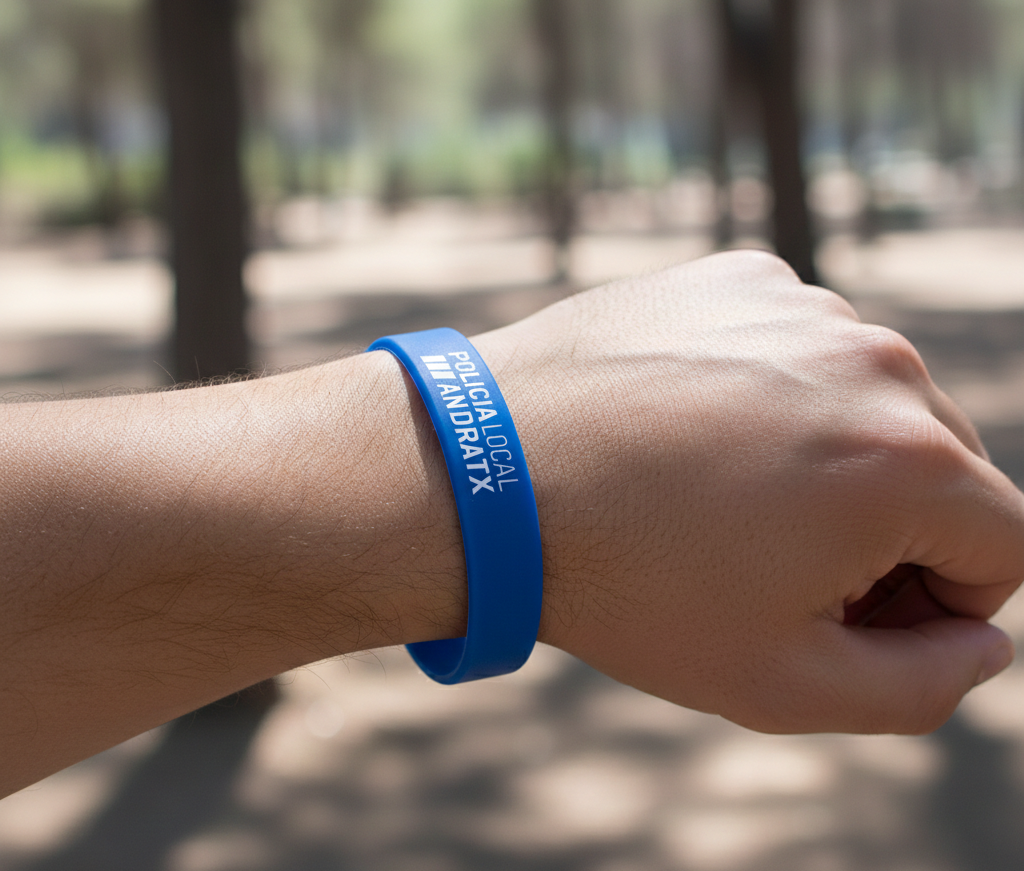 El Objetivo: El encargo consistía en la producción de un elemento de identidad visual cercano y funcional. El reto fue el diseño y fabricación de pulseras de silicona personalizadas en el color azul corporativo, integrando con alta definición el escudo de la Policía Local de Andratx y el logotipo del servicio de emergencias 112.